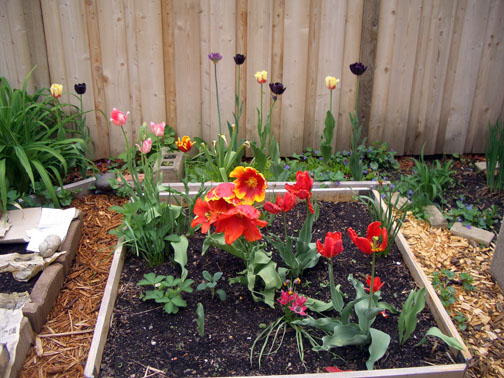 This week the late tulips opened: Queen of the Night, World Expression, and Parrot Tulips. Couldn’t be happier with them and the beginnings of some ferns and salad greens!