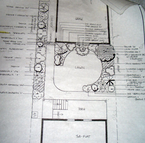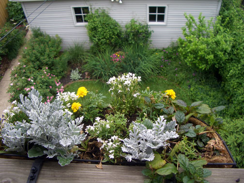 I met up with Karen to get a second story view of her garden. Like many homes in Chicago, she and Matt share the yard with their downstairs neighbors, Rick and Lindsey. When the two brothers, Matt and Rick, bought the two flat, it came fully landscaped with map included. It’s more of a holding back of nature that occupies their gardening time with peonies, iris, grasses, and clematis that are extremely well established. Matt and Karen have added containers and built a raised plot to add a little of themselves to the landscape.
